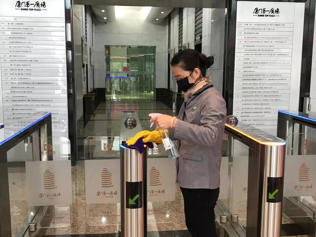 大到每日對進出人員的體溫測量登記,對辦公區域、大堂、電梯等各個大大小小公共區域的全面消毒凈化工作,以及嚴格執行復工備案制度、每日報告制度等;小到為客戶提供防控疫情指南以及電梯按鍵用紙、廢棄口罩專用垃圾桶的設置等;但凡涉及到寫字樓的疫情防控工作,廈門第一廣場物業服務中心都分派專人進行管理與追蹤,事無巨細,只為確保每一項防疫工作落實到位,確保盡最大努力為業戶織就牢固的全方位辦公防疫網。